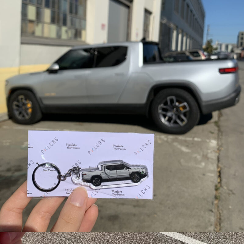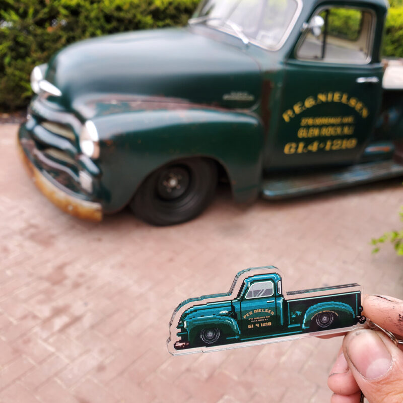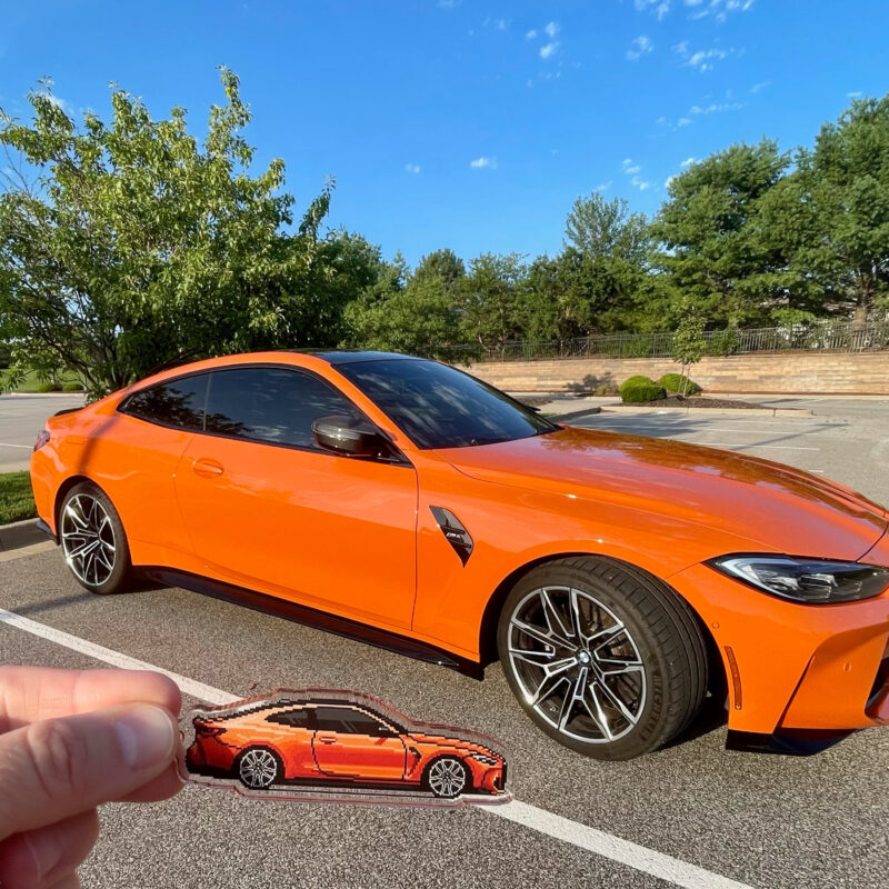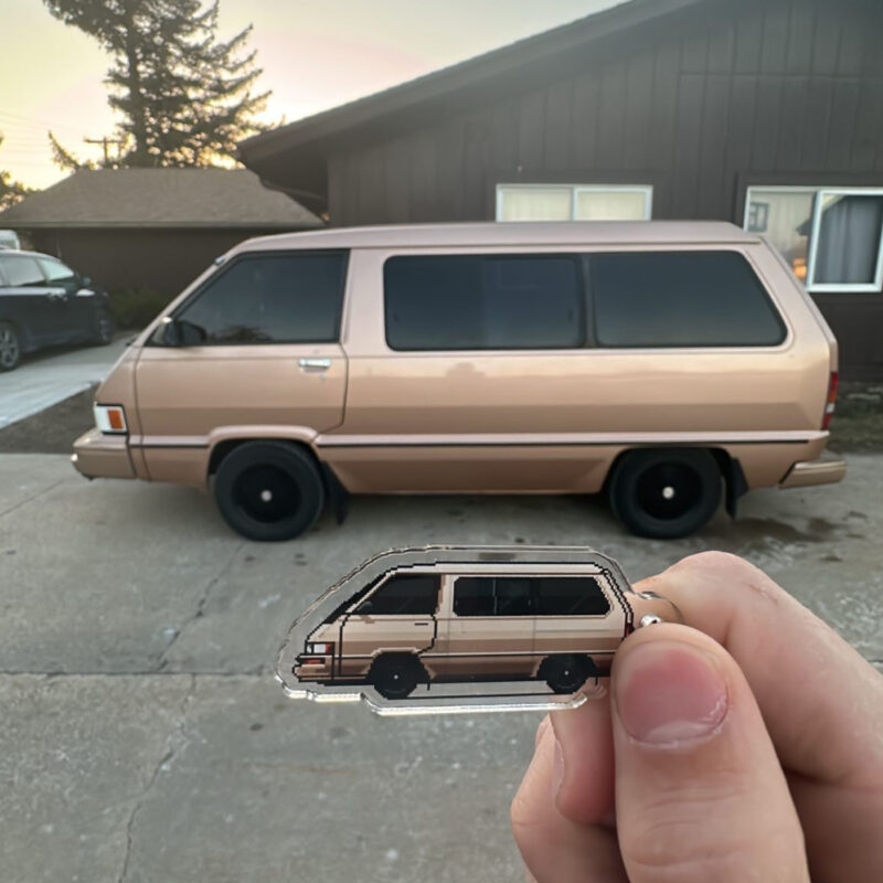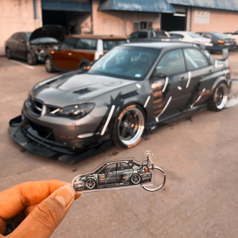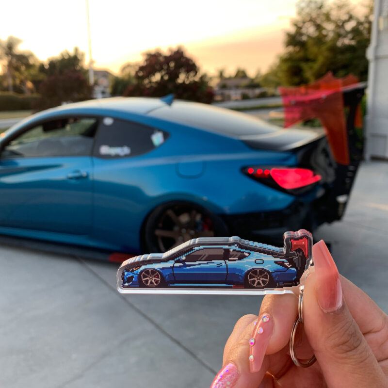 The illustration and keychain are fully customized to your vehicle, matching the color, wheels, any aftermarket parts and modifications, down to special details like stickers and everything else possible to recreate with pixel art, making it uniquely yours.
